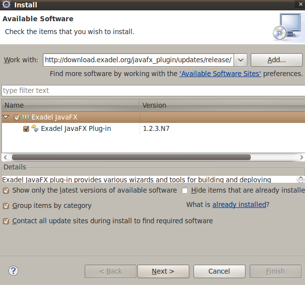 - For URL, copy and paste the following URL: http://download.exadel.org/javafx_plugin/updates/release/. This is the latest stable release. If you need the latest nightly release, then use this URL: http://download.exadel.org/javafx_plugin/updates/nightly/