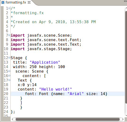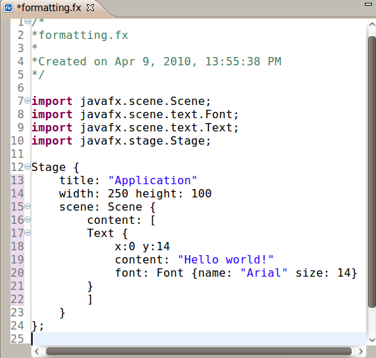 JavaFX script is a powerful UI language and has JSON-like format. One thing that you might need getting used to is formatting or where and how to indent and place various brackets once you go beyond just a few lines of code. If you are working with Eclipse, the good news is that Exadel JavaFX plug-in now has a code formatting feature. For example, if you typed something like this: