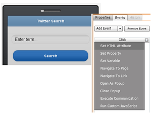 Without any need for JavaScript programming, you can add events such as onclick and onload to various UI components and then define actions for these events such as navigation, opening a pop-up panel, or invoking a service. With events and actions, you are able to simply create real interactive mobile apps.