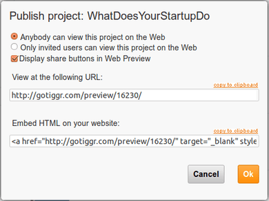 We understand that you may want to continue developing the project outside Tiggr. That’s why we have export features. Today, you can export the project as an Android PhoneGap source project or an Android binary debug (.apk) file. For the future, we are working on an iOS project and also an Android binary ready for Android Market publishing.