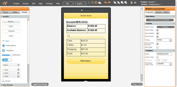 A powerful and easy-to-use visual editor. Just drag and drop the components on to the phone image. You finally get a visual editor where design-time looks exactly the same as run-time. Try it.