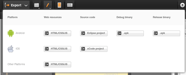 One of the most important features in Tiggr is being able to export the app as HTML5 mobile app, Android app or iOS native app. All export features are show by clicking the big Export button: