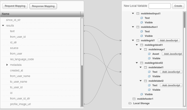 We have switched to a new and more powerful jQuery Mobile data mapping. To create mappings, simply select a variable and drag and connect to the other side. When you drag service variables into the page, the page nodes will automatically expand so you don’t necessarily need to open the page nodes ahead of time. The new mapper will allow us to expose all component properties and add additional powerful features.