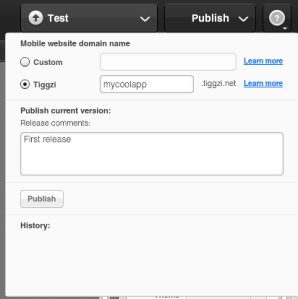 You can create a subdomain such as mycoolapp.tiggzi.net but can also use completely custom domain. This is an incredible feature because you can build the app in the cloud and then do one-click publish. Your app is published in about 3 minutes. Once the app is published, you can continue working and republish the app once the new release (new features) were added.