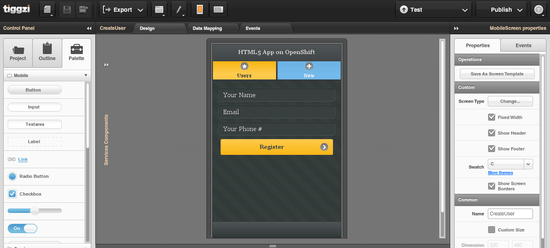 The app has two pages, and two services. One service gets the current list of users. The second services creates a new user. Give it a try and let us know if you have any questions! If you are new to Tiggzi, the cloud-based HTML5 and PhoneGap mobile app builder – simply sign up for a Free plan.