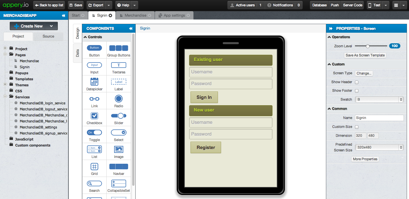 Appery.io is a complete app platform, it provides visual app dev. tools and integrated backend services such as app database, push notifications and server code (for adding custom app logic on the server). This tutorial shows how to build a jQuery Mobile connected to cloud app database. The step by step tutorial shows how to build a User Registration app and create a list of merchandise items for each user.