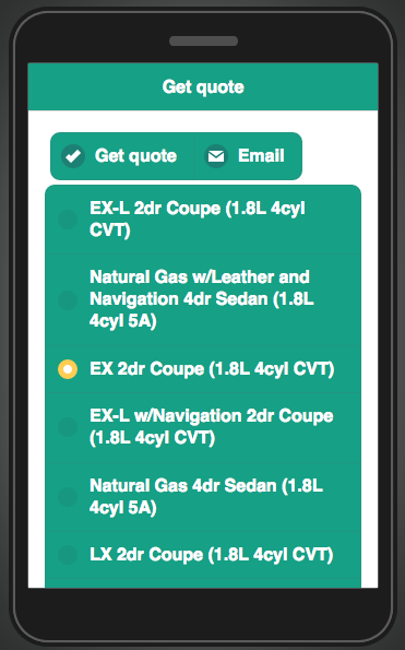 When car make selection is made, the user is shown a list of all models for that particular make (selecting Honda):