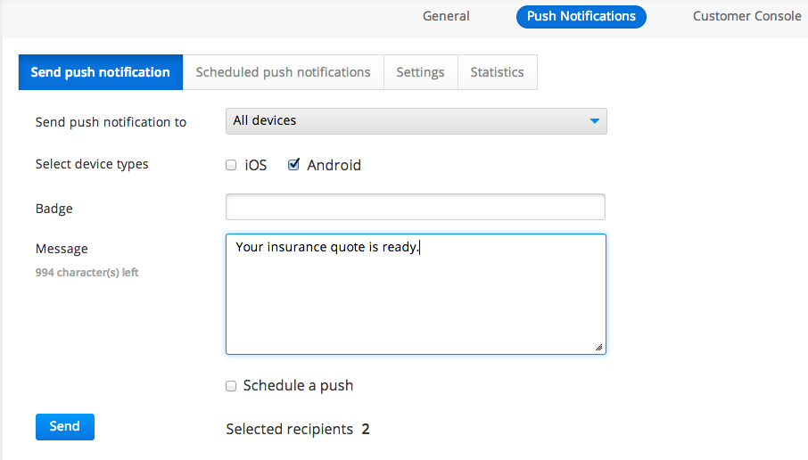 I have also added push notifications. This allows the agent to send a push message to the customer when his/her quote is ready: