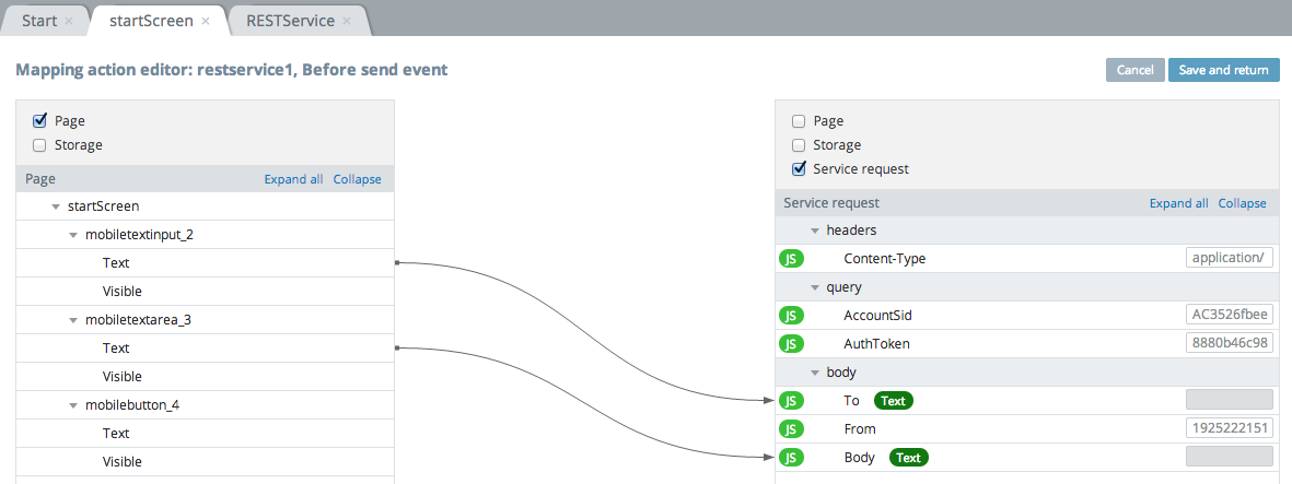 Once the service has been created and tested, it is added to the page and mapped to the page using a visual binding editor: