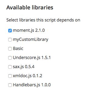 You might be wondering how can we use Moment.js if the library is not loaded/referenced anywhere? In addition to writing scripts, you can also use libraries. You can load an existing 3rd party library or you can write your own library. Then you can make the script be dependent on one or more libraries.