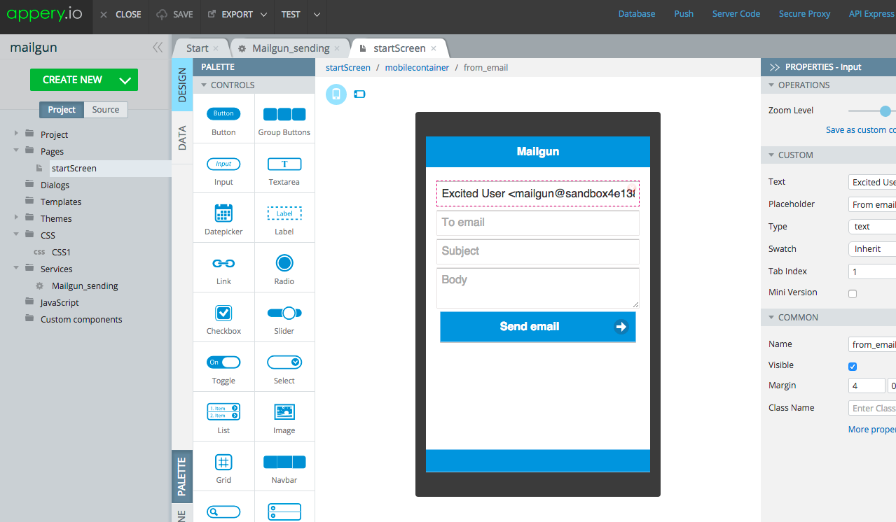 Mailgun is email for developers. Mailgun has elegant REST API to send and receive emails from your mobile app. I know that many Appery.io developers send emails from their apps for registration, confirmation, and everything else. To make it simple to use the Mailgun API in an Appery.io, we have introduced a Mailgun plugin in Appery.io.