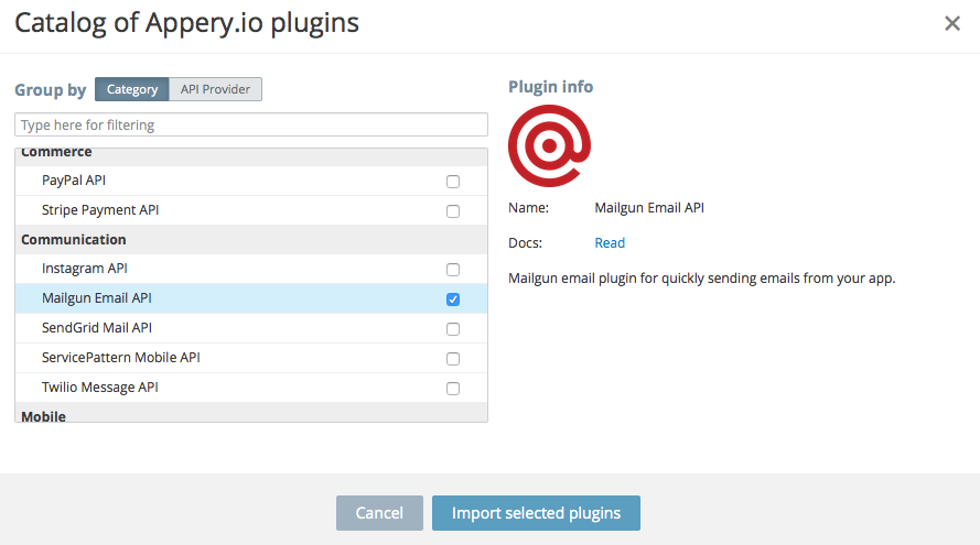 - Find Mailgun Mail API under Communication category. Check the plug check box and click Import selected plugins button