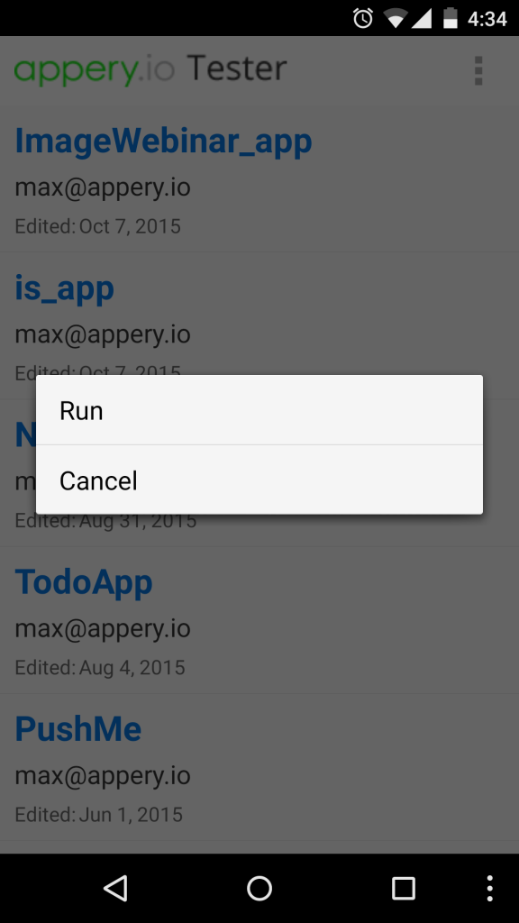 Now simply tap on any app and the real hybrid app will be launched on the device. What’s really good is that this is the real hybrid app running on the actual device. This means you can test any native API (every app in Appery.io has Cordova bundled) and you didn’t even have to install the app on the device. You can go back to the App Builder, make changes to the app and then simply reload the app in the Tester app. You will get all the updates you must made right away (just don’t forget to click Save in the App Builder).