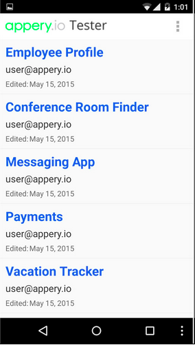 When you are building a hybrid app in Appery.io platform, you get access to a simple, yet very powerful app called Appery.io Tester app. This app, freely available for iOS and Android makes it very simple and fast to test your hybrid app on the device without having to install the app. Running the app on the device helps you test native APIs such as camera very quickly. This is how the app looks: