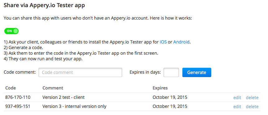 Share this code with anyone you want, all they need to do is download the free Appery.io Tester app for iOS or Android. On the first screen they click “Enter an app code”, enter the code you gave them and the app will be launched on their device.