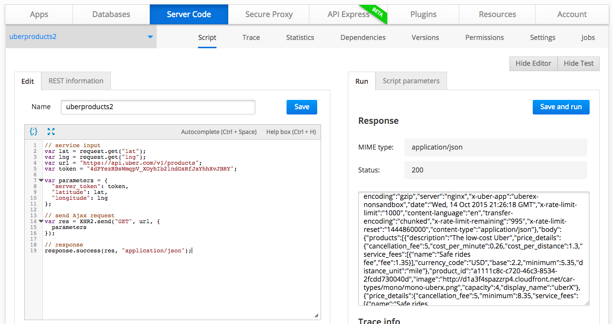 Last Friday I blogged how to invoke Uber REST API from the server. I was looking at Uber documentation and realized there is a better and more elegant way to invoke the API. Uber specifically provides a server token. Instead of using a header parameter, I have updated the script to use the server token. This is how the code looks now:
