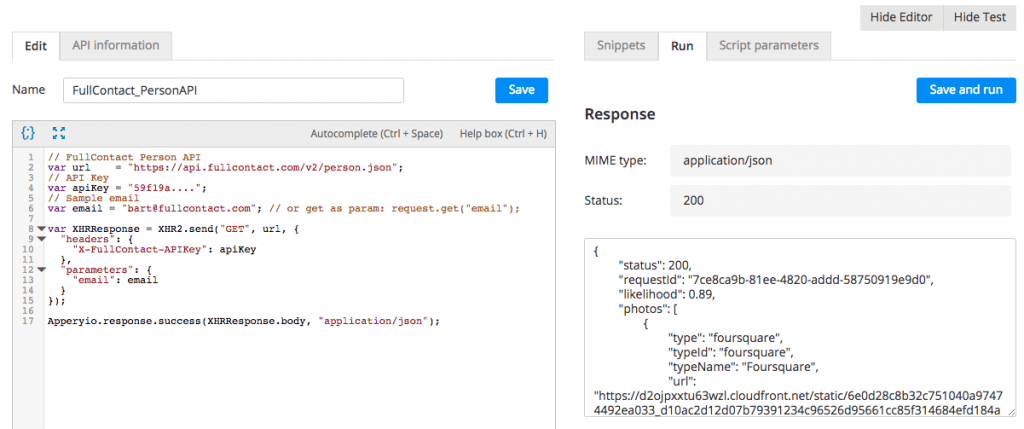 To make it simple to use FullContact API, we created a Server Code plug-in that quickly creates a script to invoke the Person API. You only need to set the FullContact API key. The following animated GIF shows how to insert the FullContact plug-in and its script: