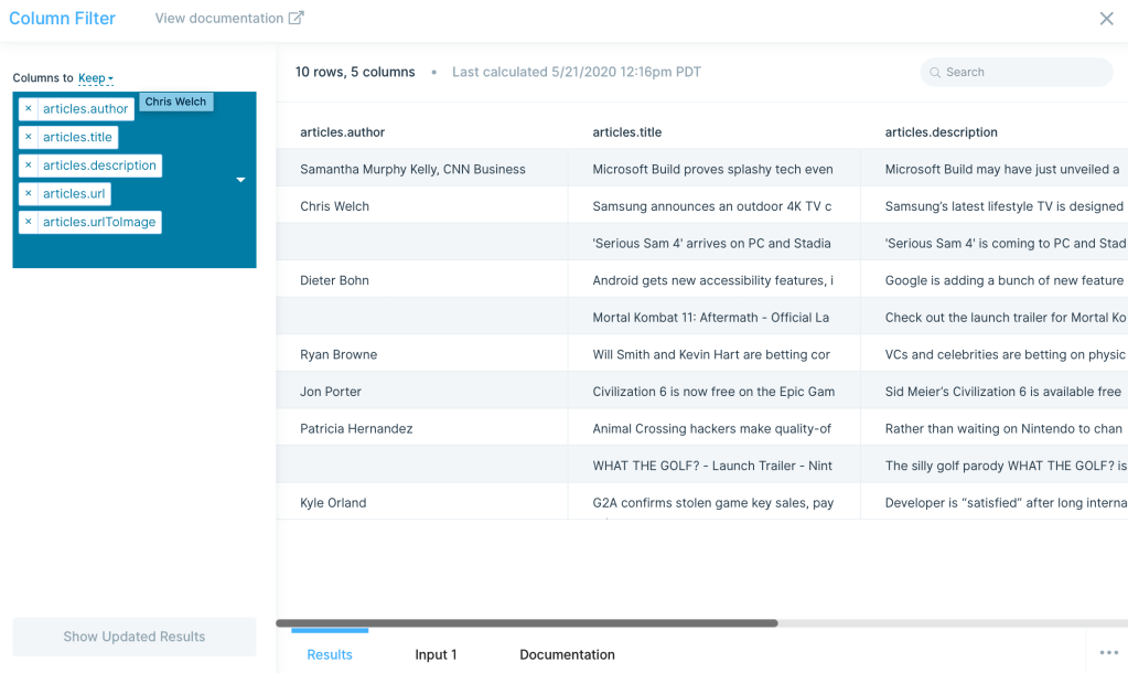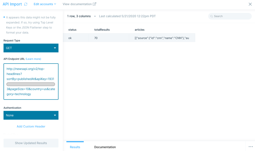 The next step is JSON Flattener. This steps take the API response and puts it in columns/rows format. Below we are specifically flattening the articles column.