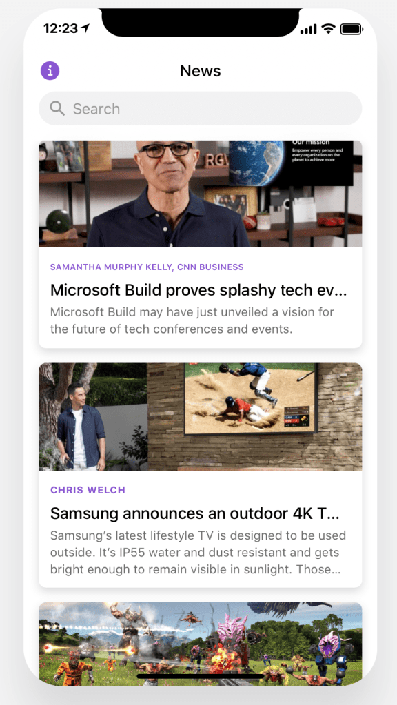 I was building an app in Glide that displays the latest news using News API. I connected the app to a Google Sheets spreadsheet where I entered a number of news stories manually. The app looks like this: