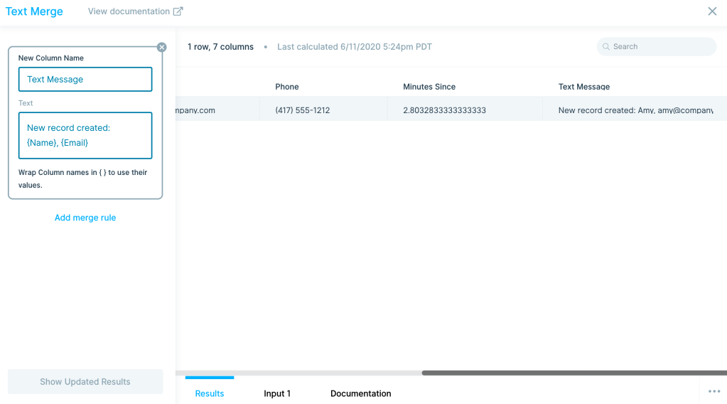 In the Text Merge step a new column is created with the message to be sent. The same message will be used for email and text message.