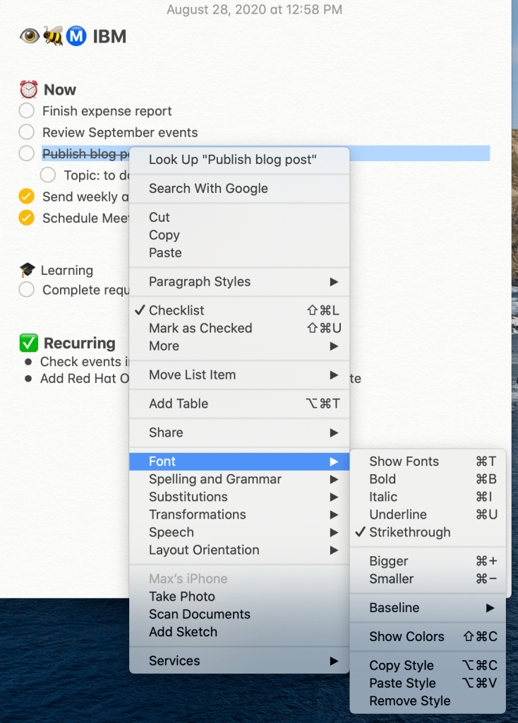 There are more options in the context menu. For example, you can cross out items, add more formatting and share: