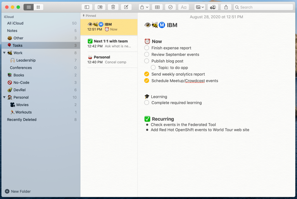 I created a folder called Tasks. Inside the folder I have three notes. The main note is pinned so it is always at the top. That’s my main to do list.