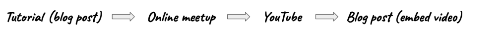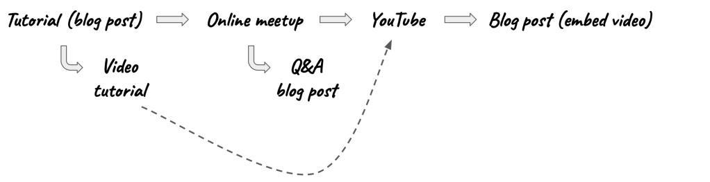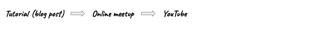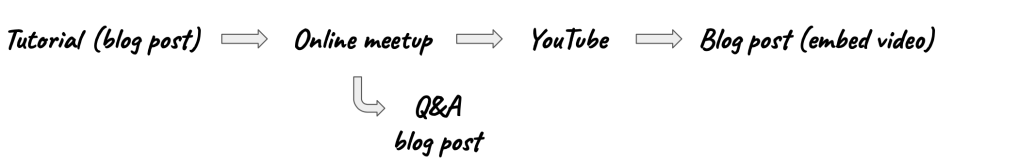 The tutorial you started with can give you more content ideas. An online meetup usually has an overview of a technology and then a hands-on portion. You can also record a video which shows only the hands-on portion and upload it to YouTube as well (shown by dashed line). It can be a very technical, step-by-step video tutorial. There is some overlap with the online meetup but that’s OK. I’m sharing this as a framework and you can decide what content makes the most sense to create.