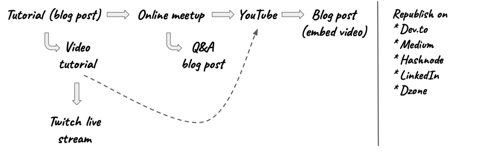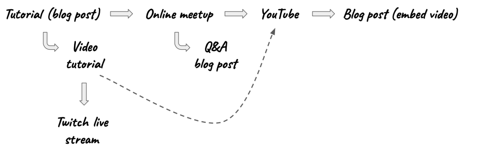Last year I published How content creates content blog post. It’s one of my favorite blog posts. It shows how one piece of content can produce more content. Since everyone shifted to running online events/meetups I wanted to update this blog post and also offer new content ideas for the virtual world. I know it’s not always easy to come with content ideas. This blog post should help you develop more content. I also recommend you read How to scale Developer Relations with online meetups.