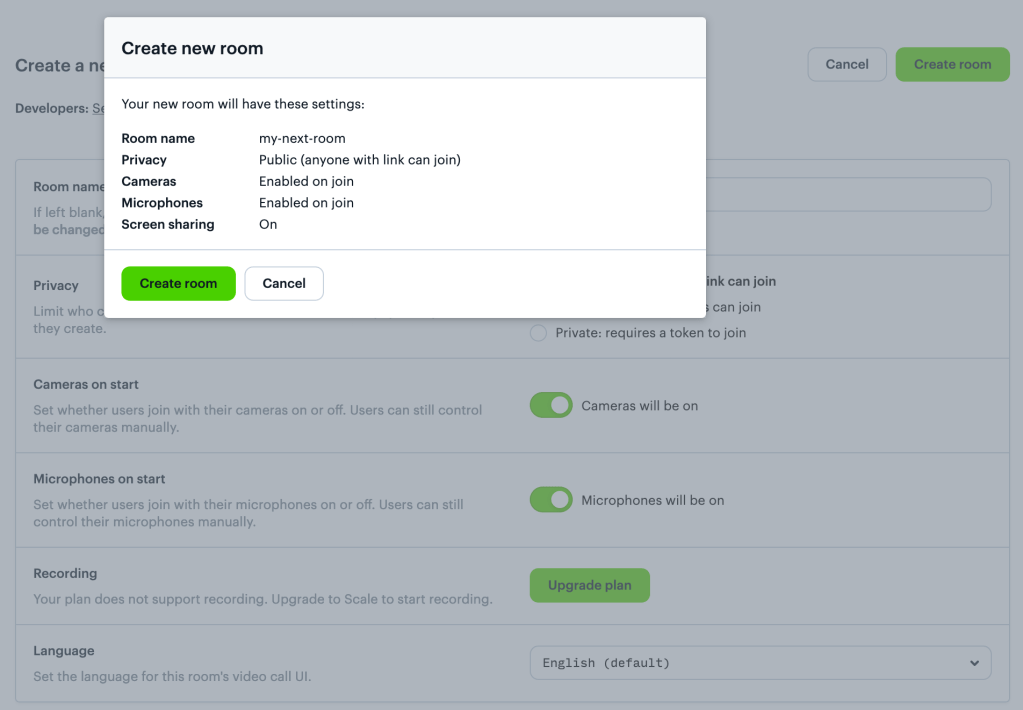 In the next step you can enter a room name and other settings, click Create room to see the following confirmation popup: