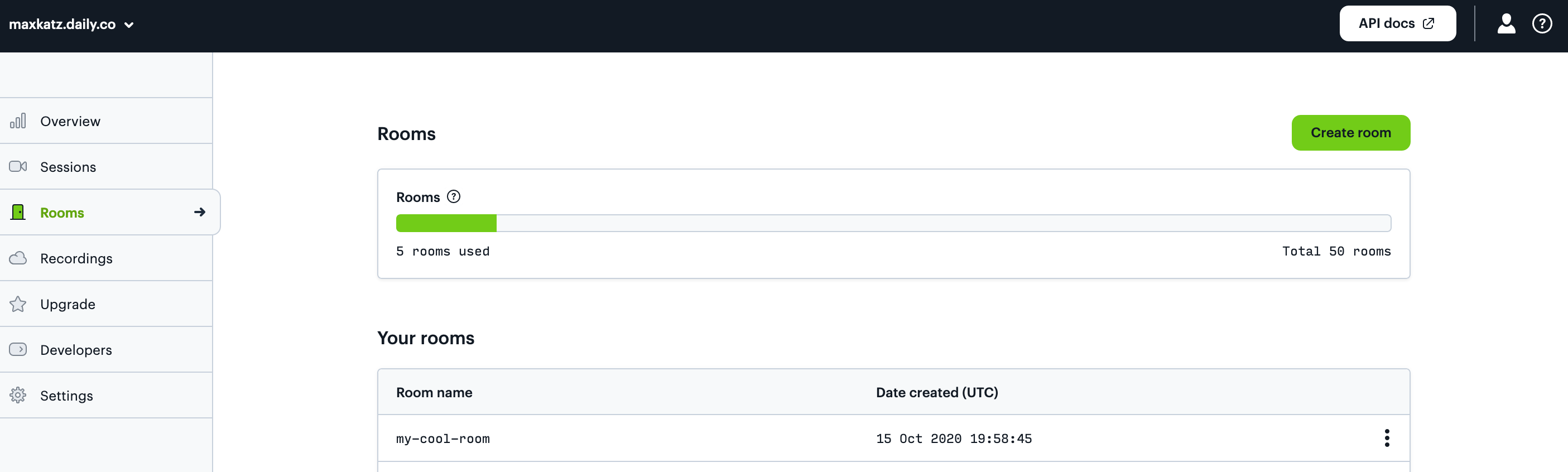 From Daily dashboard main page click Rooms and then Create room button.