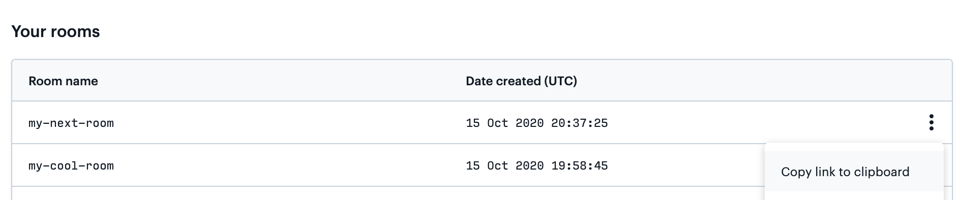 After you click Create room, you will see the newly created room listed: