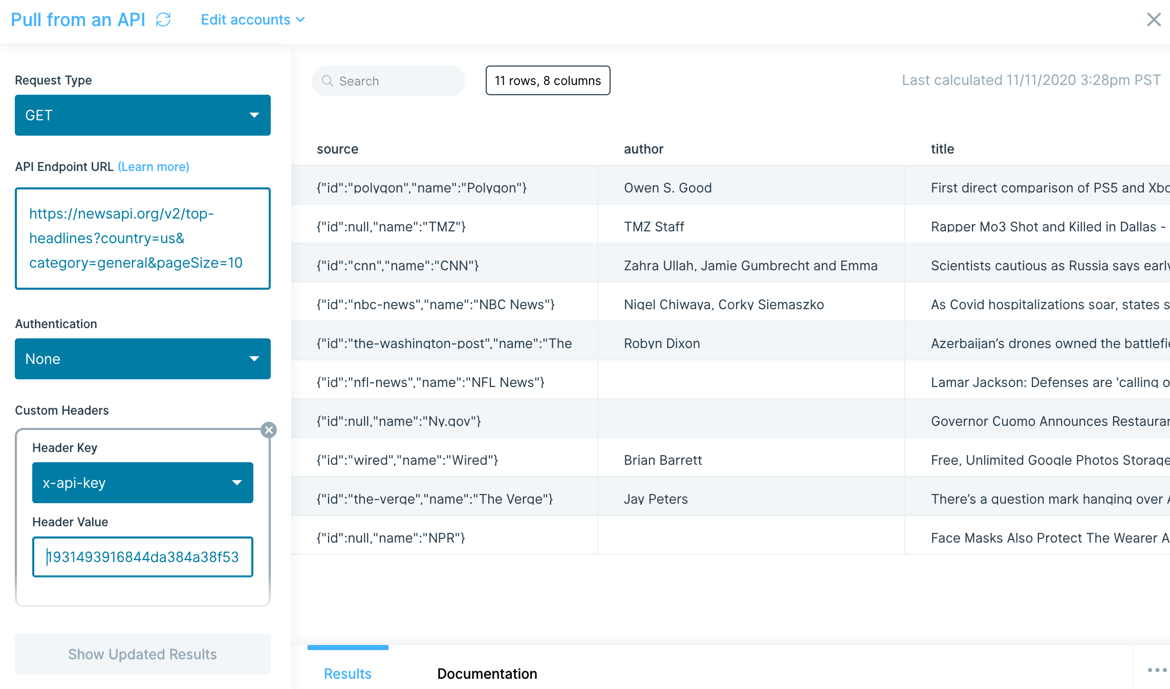 - Add a custom header x-api-key and set its value to your Newsorg API key