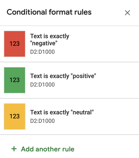 The four columns in Google Sheets are the same columns (and names) from the Parabola flow. In the last column (sentiment score label) I added conditional format rules:
