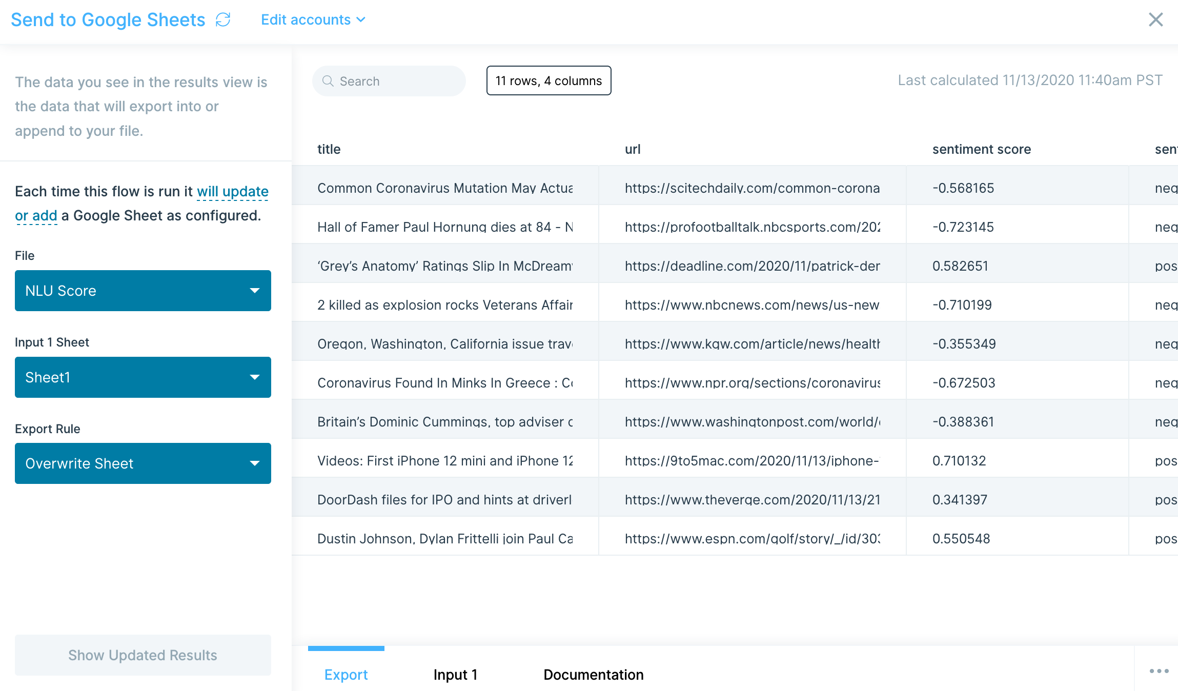 - Export rule: Overwrite Sheet (This will overwrite each run. You can also append each run)