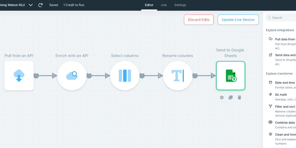 Enrich with API step takes every row and enriches it with an external API call. In this tutorial you need to pass the url column to Watson NLU service. Watson NLU service will then analyze the URL and return its sentiment score.