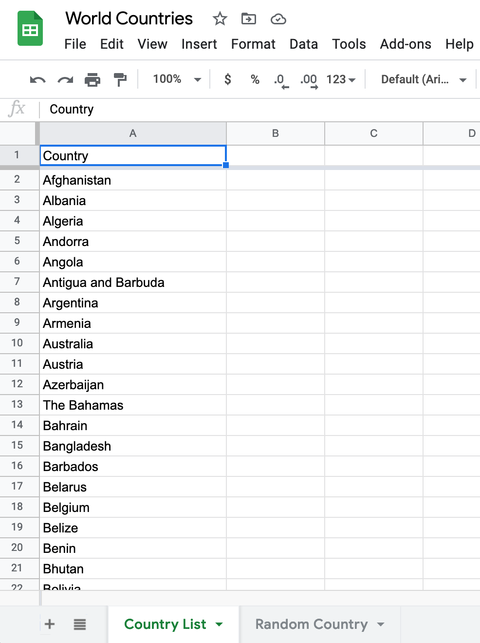 Google Sheets is used to store the quotes. It stores a list of all the countries (that’s the random data) and in another sheet it stores the randomly selected country to be used in a tweet. The first sheet stores all the world countries: