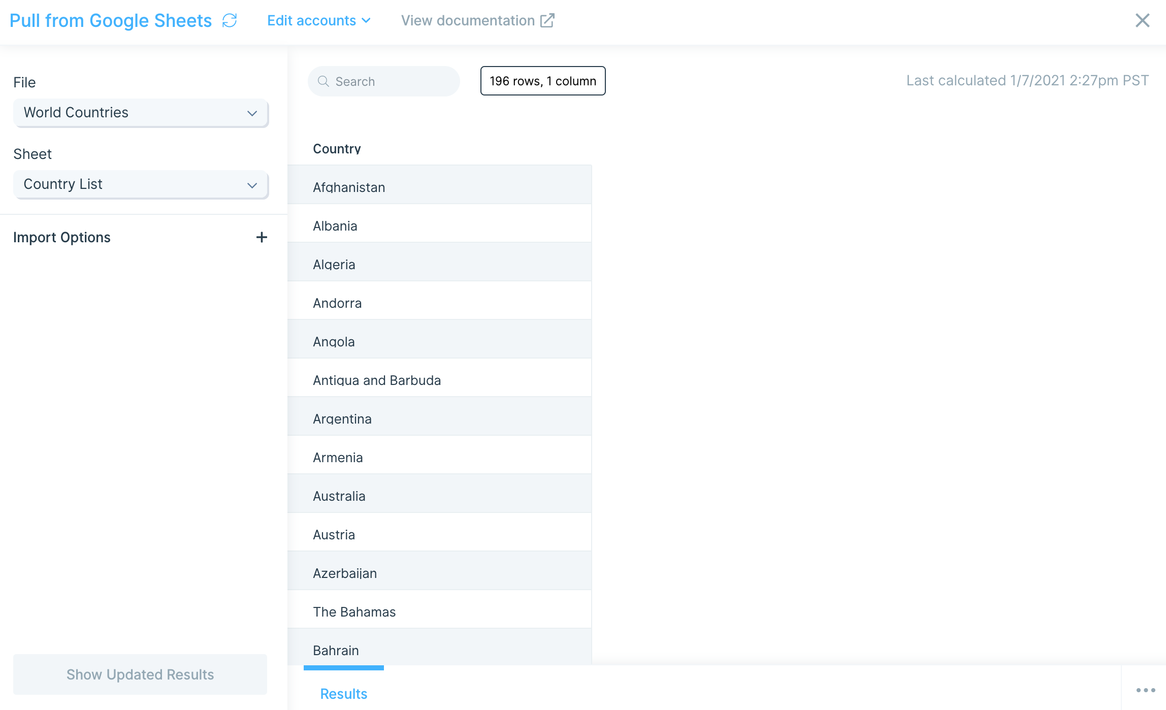 The first step in the flow is to load a Google Sheets file which has all the world countries.
