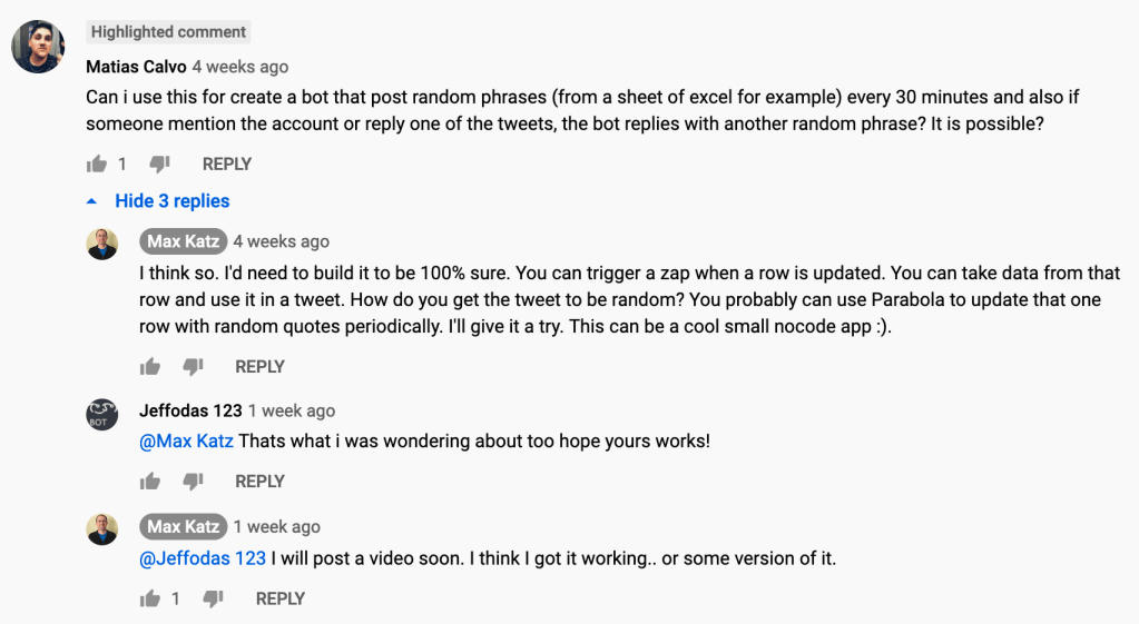 This blog post showed show how to create a Twitter bot powered random data. You can use any random data you like. Just keep in mind that Zapier will turn off the zap if a duplicate tweet is created (you would need to go and turn it back on). It’s not a complicated examples but shows the power of no-code. It shows how you can leverage three different no-code tools (Google Sheets, Parabola, and Zapier) to build a small working application (bot). I’m always happy to hear you feedback. If you have any other bot or no-code ideas, please let me know!