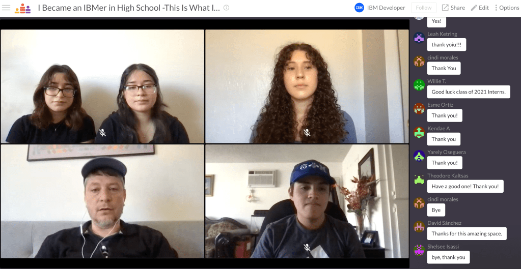 Cristina, Carolina, Victoria, and Rodrigo worked on different projects during the internship. At the end of their internship (this week) they hosted a live Crowdcast online meetup where they shared how they became IBM interns, what projects they worked on, and what their experience was working at IBM. Joining a big company like IBM when you are only a high-school senior can be exciting and also scary. They did a wonderful job, they learned a lot, they loved working with IBM folks and I believe will remember this experience for a life time.