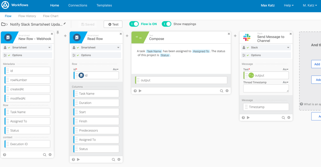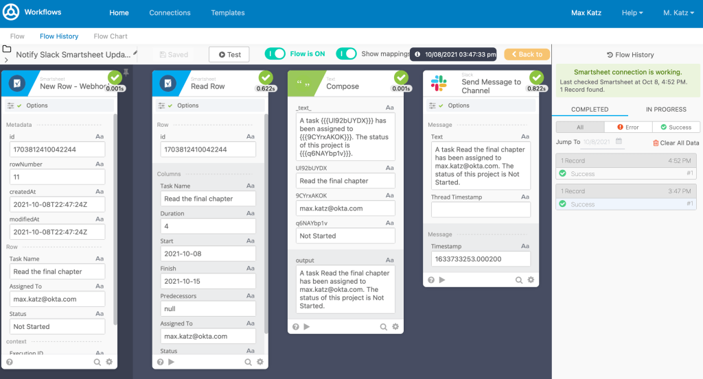 I continue to learn about Okta Workflows I built a number of automations this past week. Here is one such automation which notifies in Slack when a Smartsheet sheet new row is inserted in 10 pictures.