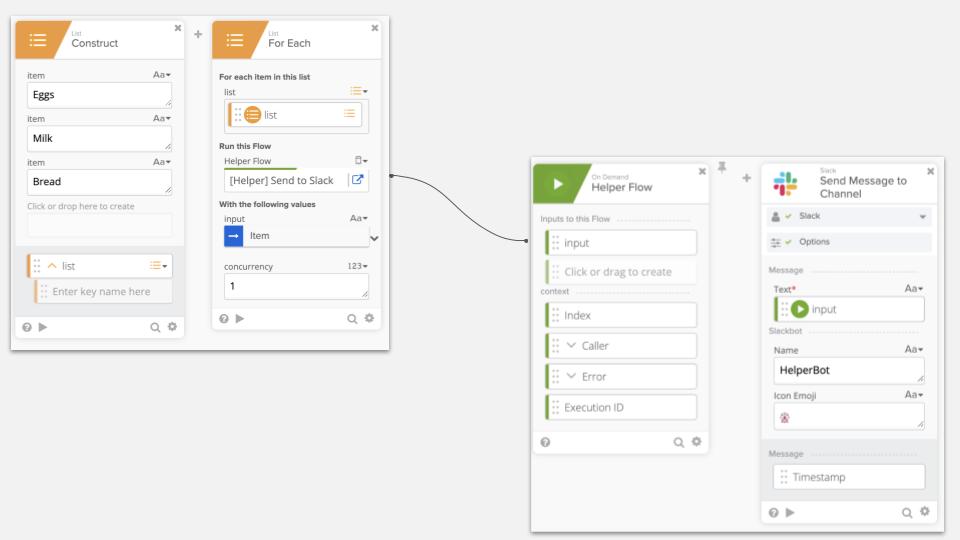 This video shows how to build a for each loop using a helper flow. A list with three items is created. Using a helper flow and For Each card, every item in the list is sent as a message to Slack.