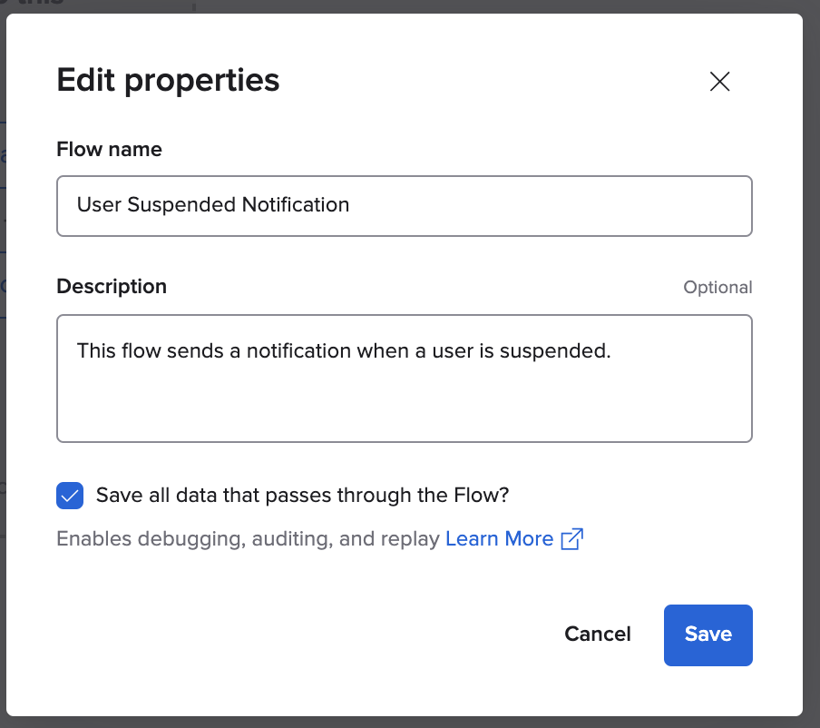 - For description, enter This flow sends a notification when a user is suspended.
