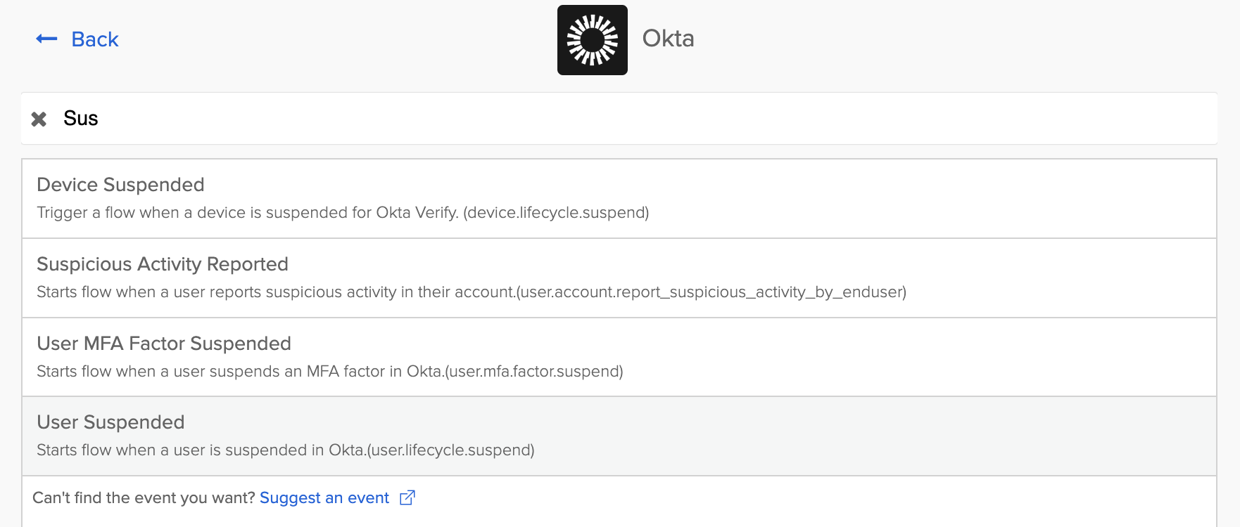 - In the Okta events menu, look for and select User Suspended event (you can search for the event).