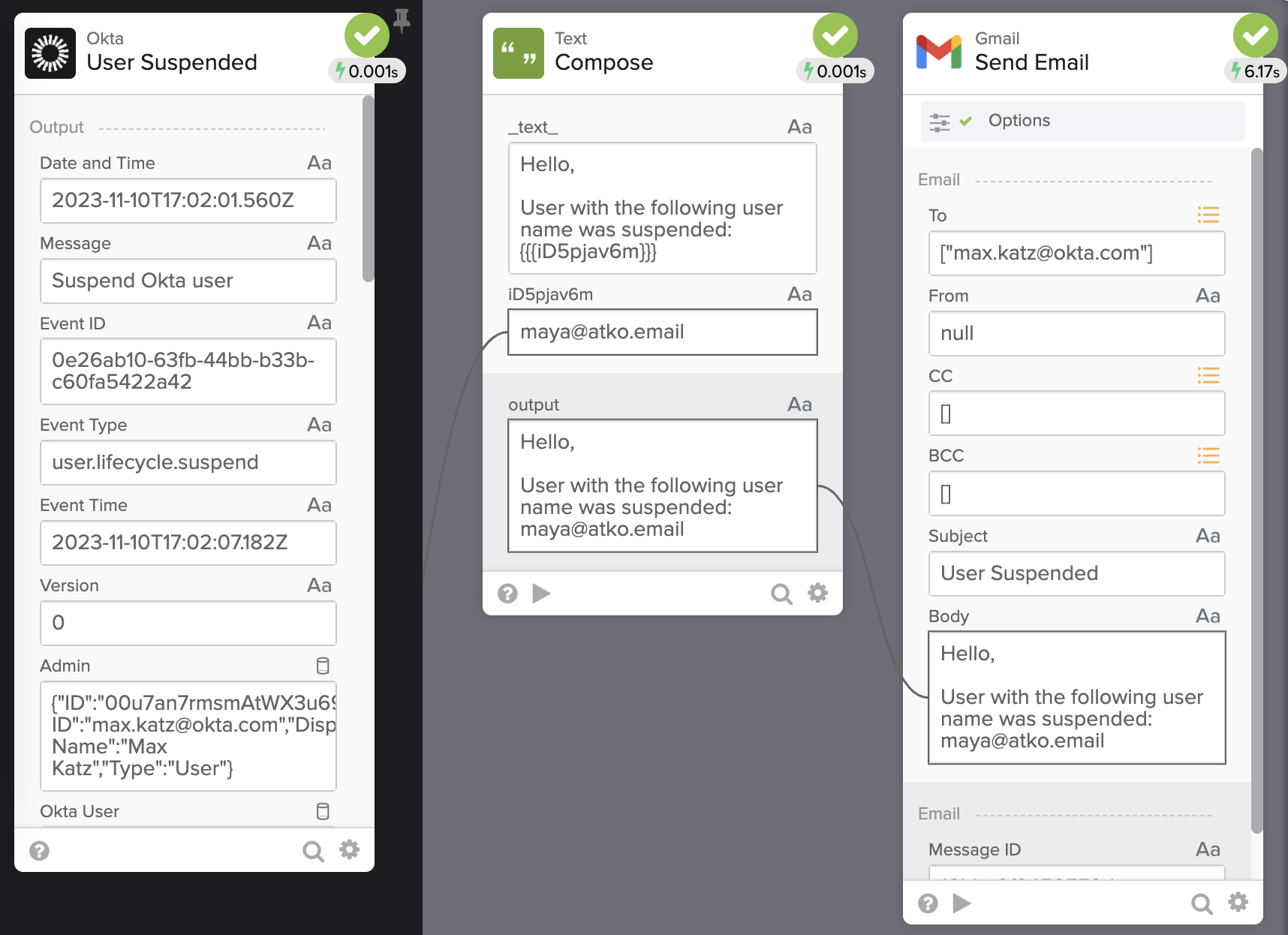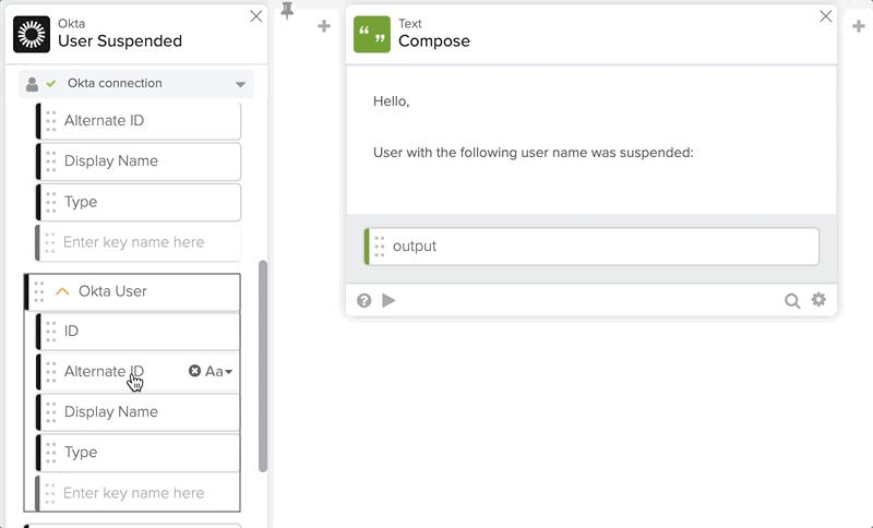 - Drag and connect the Alternate ID field from User Suspended card and place it after suspended: word in the Compose card.