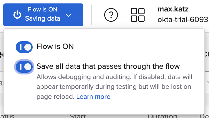 - Also check the Save all data that passes through the Flow? checkbox. You will be using this capability at the end of this tutorial.