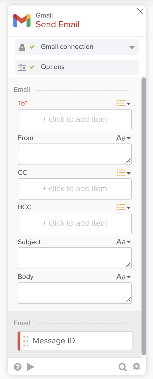- If this is your first time using the Gmail card, click + New Connection and follow the steps to authenticate your Gmail account