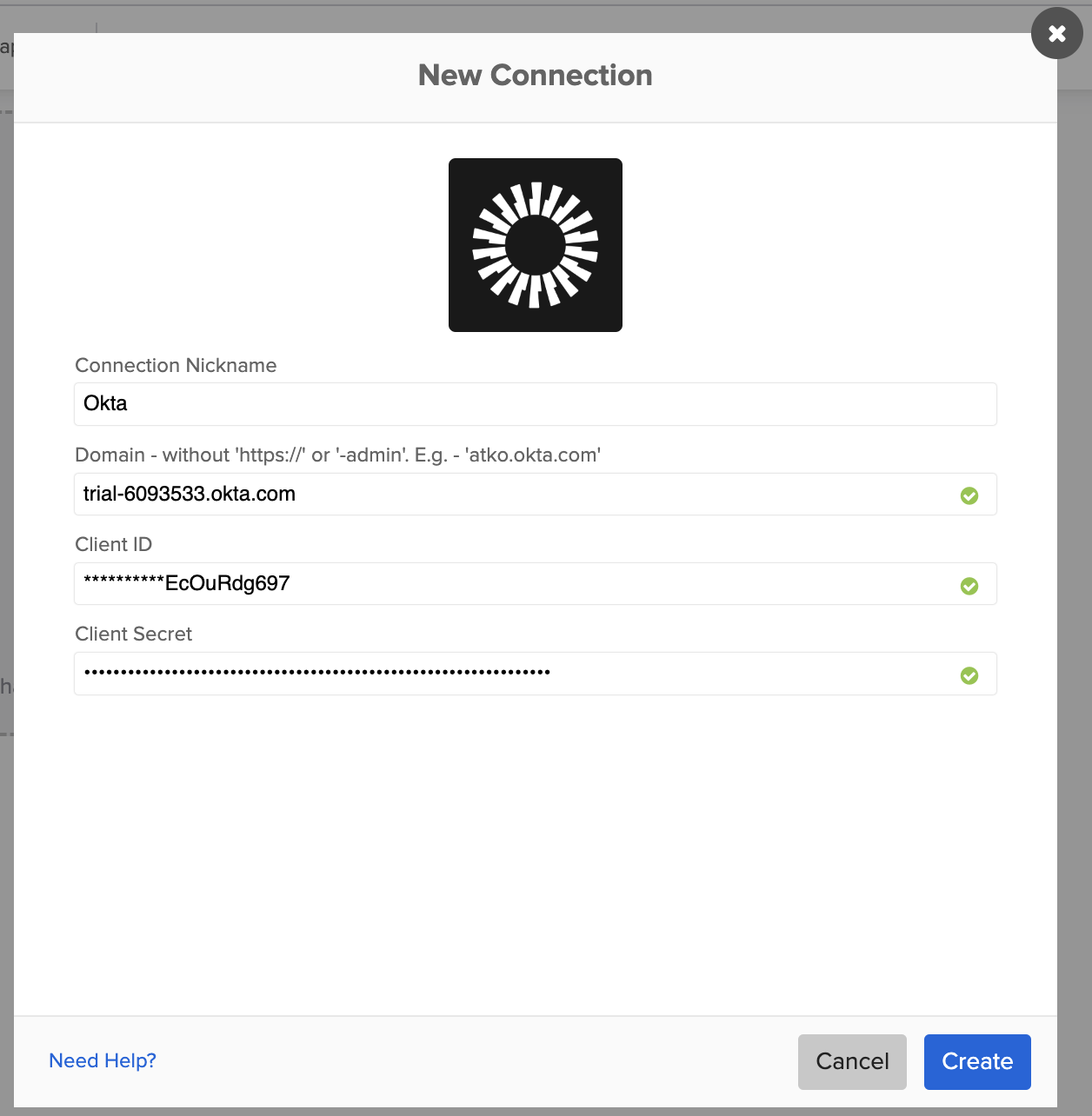 - Click Create to create the connection to Okta.