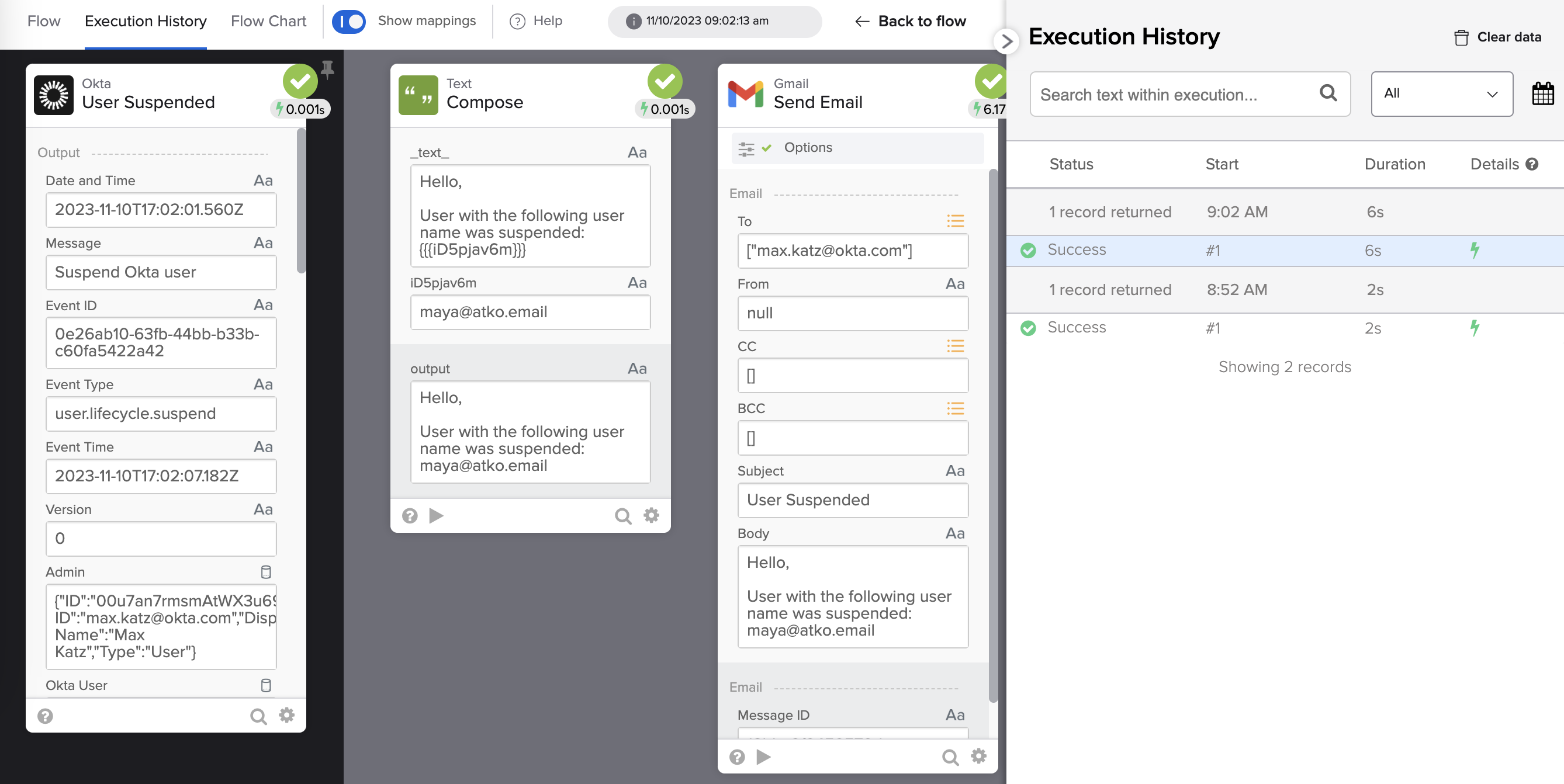 If you select another user to suspend, another flow execution will be added. In this flow run, the user maya@atko.email is suspended: