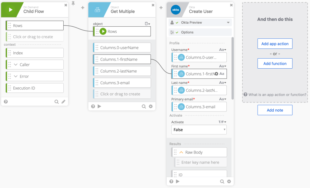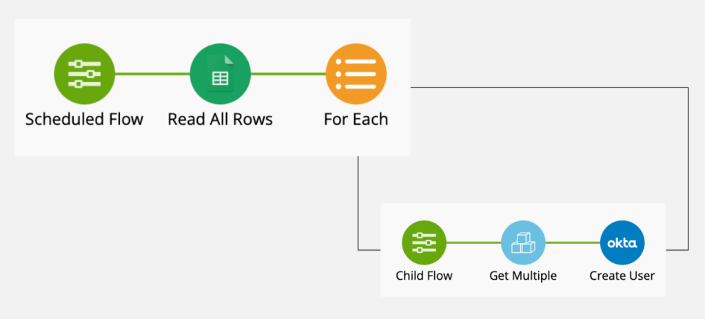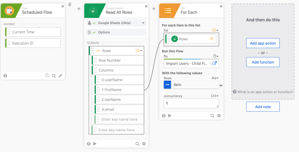 There are often disconnected user populations like contractors, or certain offices that need to be imported into Okta. A CSV or flat file is the easiest way to create those users in Okta. This flow will import user information from a Google Sheets document and create new users in an Okta organization.