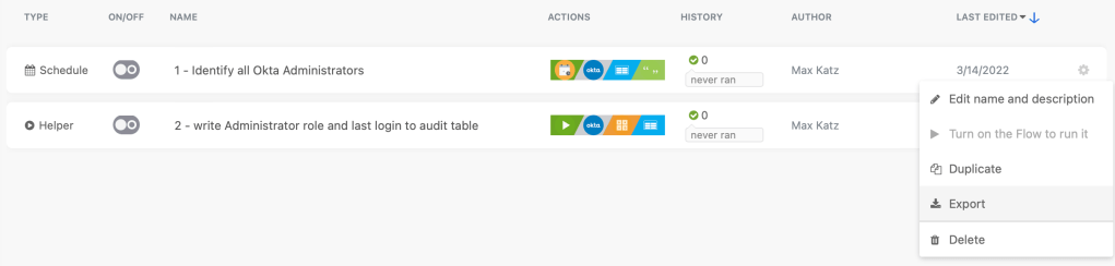 One more thing. You export a flow with an Okta connection and share it with someone. When that person imports the flow and they have an existing Okta connection, that connection might be chosen automatically. It might seem like your connection informaiton is there but it’s not. Your connection information was removed during export. Something to keep in mind.